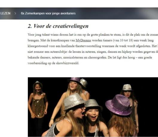 Voor jong talent wiens droom het is om op de grote planken te staan, is dit de plek om de zomer door te brengen. Met de kunstkampen van MyDreams worden tieners (van 10 tot 18) een week lang klaargestoomd voor een knallende theatervoorstelling waarmee de week wordt afgesloten. Het kamp is niet zomaar een acteerclubje: de lessen in acteren, zingen, dansen en hiphop worden gegeven door bekende dansers, acteurs, musicalsterren en choreografen. De lat ligt dus hoog – een goede voorbereiding op de showbizzwereld.
